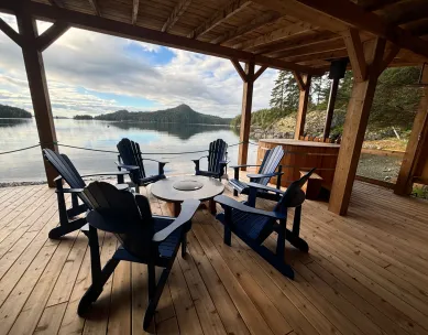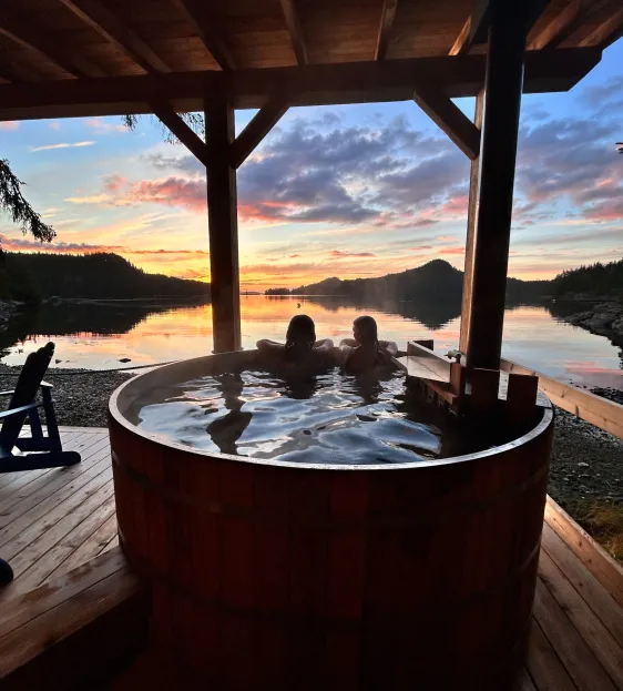 Oversized towels, a freshwater rinsing shower, and cozy deck chairs by the fire complete the experience. Whether soaking in the lush, green rainforest, gazing at the breathtaking ocean view, or spotting eagles soaring overhead, this space is designed for pure, unhurried enjoyment.